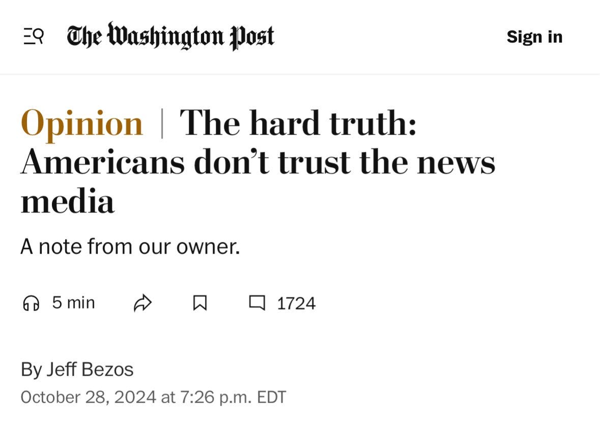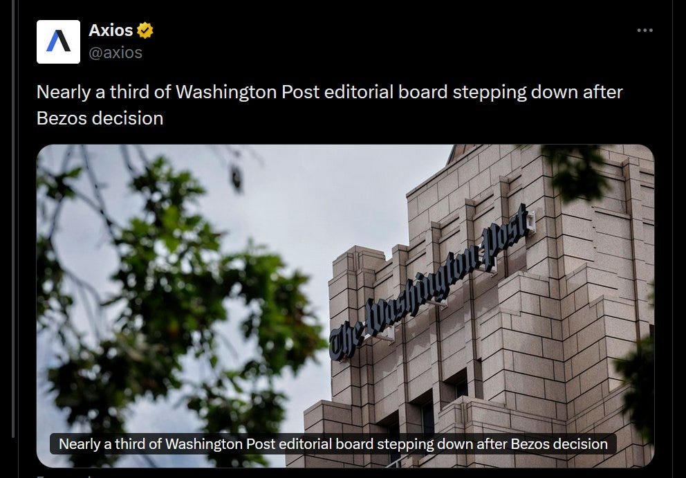 Newspapers and legacy media are terrible, decaying businesses. Bezos does not own the Washington Post for the cashflows. The 200k ragequit unsubscribes WaPo got from the endorsement decision don't matter.