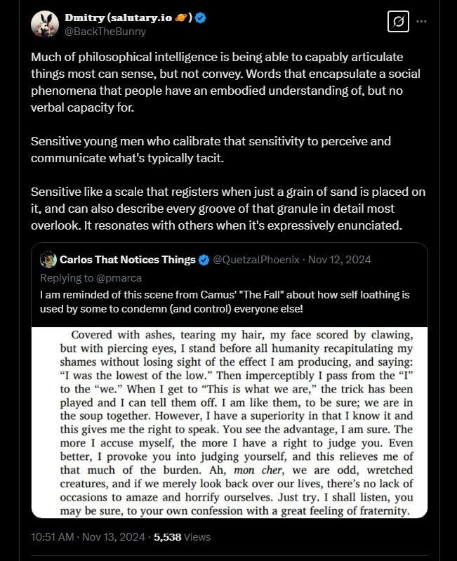 I’ve come to learn the quality of someone’s thinking is inversely proportional to how many names and ‘well so-and-so says this’ they rely on. When they bombard you with the opinions of others, name-dropping to make it seem credible, they reveal themselves to be operating entirely in someone else’s frame, exhibiting little to no ability to synthesize insights or assess information on its own merits… “Did anyone else say it’s okay to think this? What book is this from?”. These types can only interpret what you say if it’s sufficiently couched in credentials.