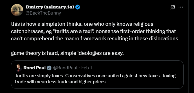 The “tariffs are a tax” crowd are basically echoing a religious chant. It’s pure first-order visceral reaction that sees tariffs and their impacts in a vacuum. It demonstrates no Nth-order understanding of the structural dislocations that tariffs can address if used properly.