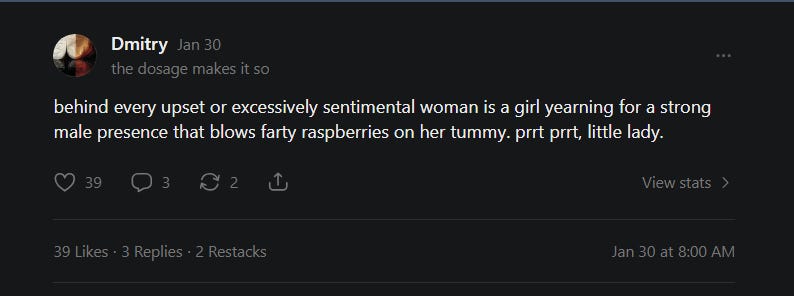 A pretty girl writes carelessly because she can. Lowercase, no punctuation, vibes-only explanations. She assembles letters whimsically and posts with abandon. Attention is heroin for the female mind, and she shoots it right into her veins. She doesn’t have to try in real life, and she doesn’t try on Substack either. Yet you read it anyway, because carelessness from someone beautiful feels like being let in on a secret.