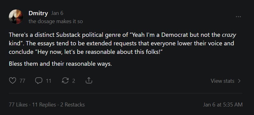 Middle-aged, middle-class writing has a penchant for middle-ground stances. The perimenopausal phase of centrism. A defensive crouch with homeostatic desire. They have enough to want to protect it, but not enough runway to build new positions. Delivering takes that feel as if they were approved by an HOA board.