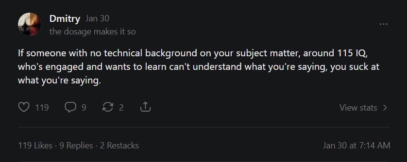 Those who aren’t elite but believe they should be overdecorate their meditations: upper-class references, turgid philosophical vocabulary sprinkled in like truffle oil on a gas-station sandwich. Writing that wears a three-piece suit to go to the mall. Output engineered to impress others, extrinsically motivated. The textual equivalent of a leased Lamborghini due back at 9 AM.