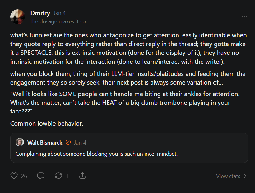 Physically unassuming and emotionally unfulfilled, he learned early that direct confrontation gets you hit. So he weaponized implication. Soft-dunking via quote-reply with the energy of a kid who knows exactly which words don't technically count as talking back.